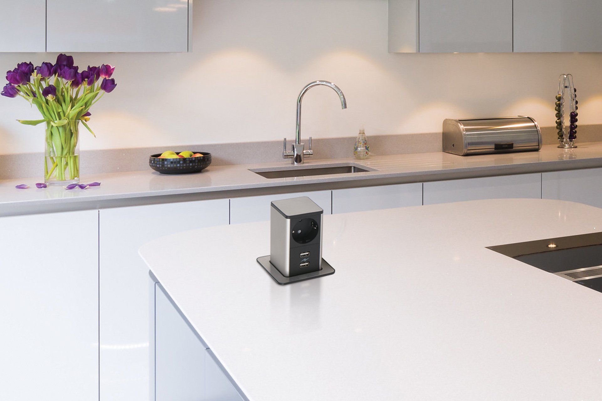 Auf Knopfdruck die Steckdosenleiste ausfahren lassen - per Federdruck fährt der Turm elegant aus der Tischplatte. Falls er nicht mehr benötigt wird, kann man ihn einfach wieder verstecken.